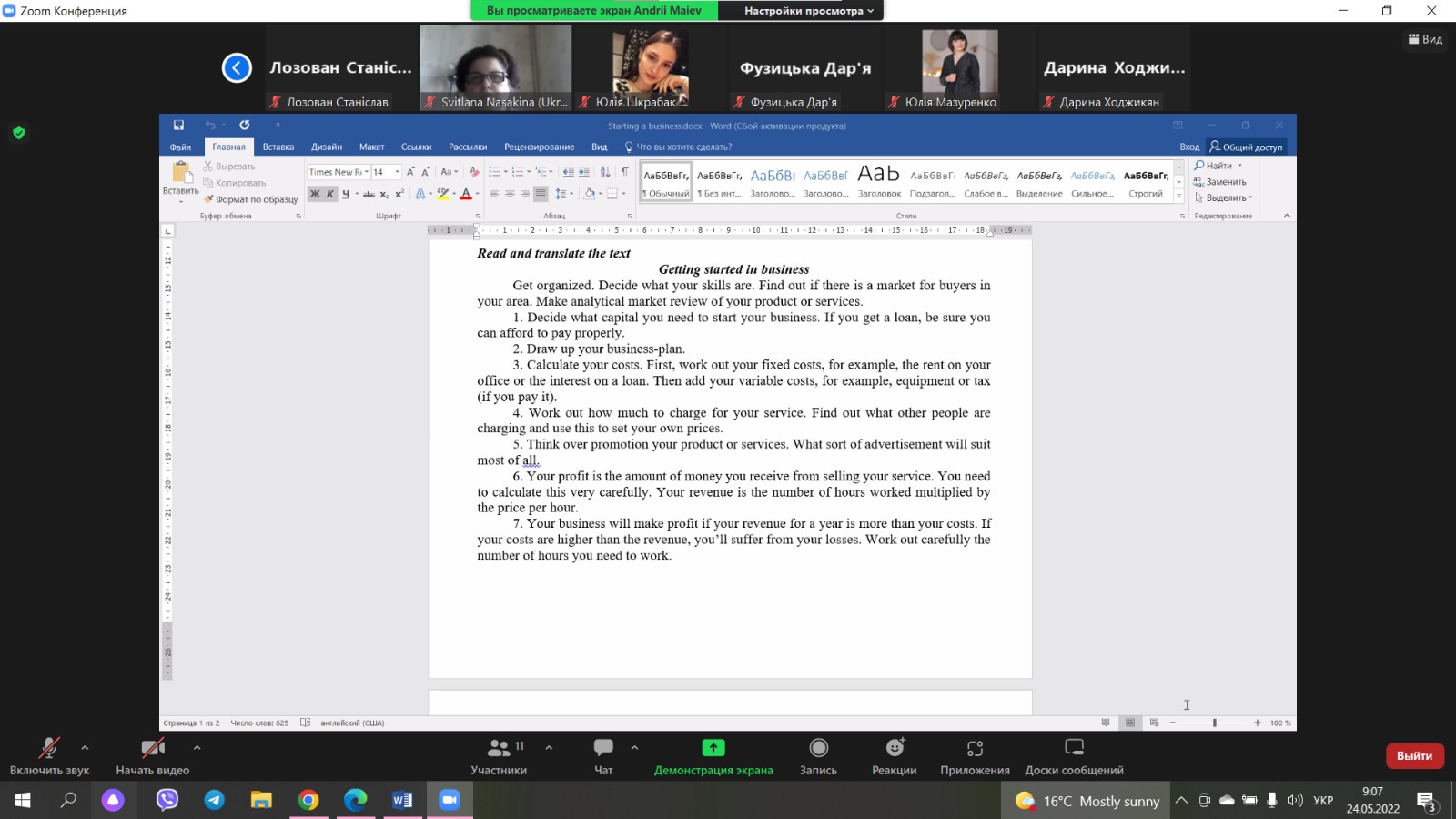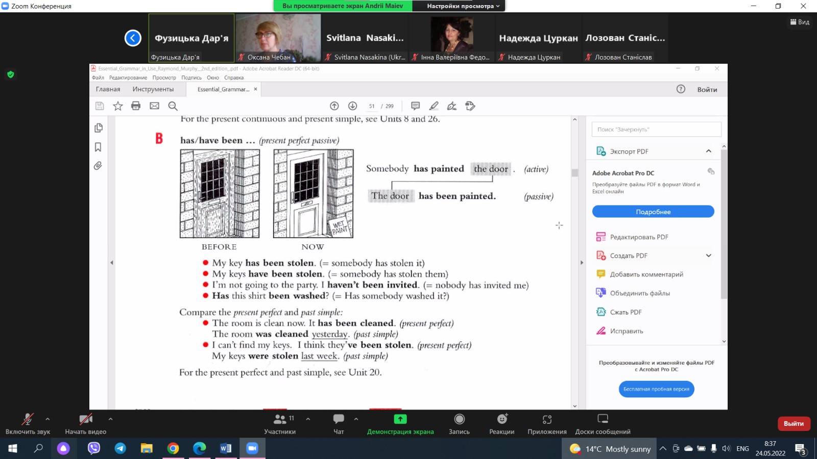 Студентам було запропоновано різні типи завдань: граматичні вправи, читання та переклад тексту, завдання на знання лексики, формулювання запитань та відповідей. Студенти групи працювали активно, продемонстрували достатньо високий рівень підготовки.