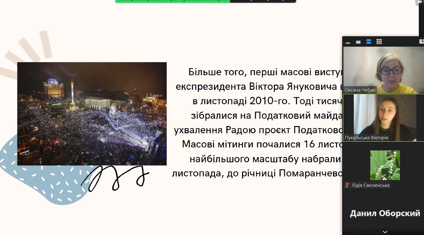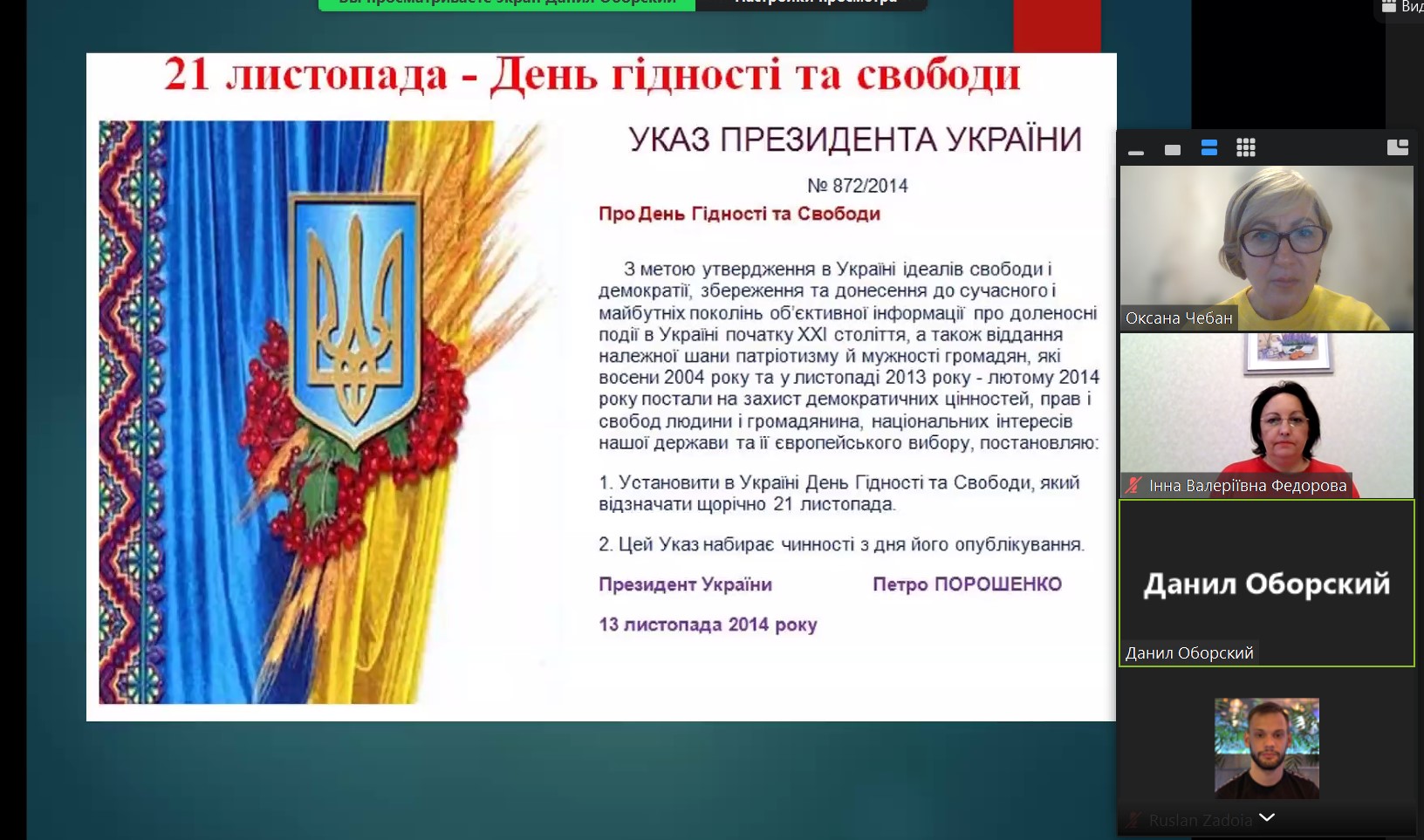 Кафедра філософії, історії і політології провела кураторську годину присвячену вшануванню державного свята – Дня гідності та свободи, яке відзначають 21 листопада згідно Указу Президента країни від 13 листопада 2014 року.