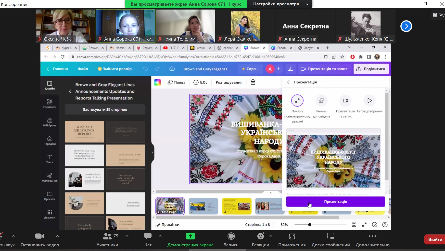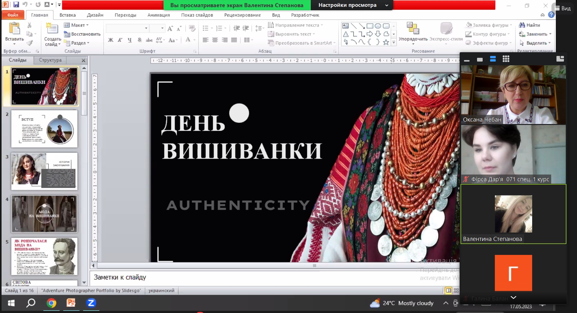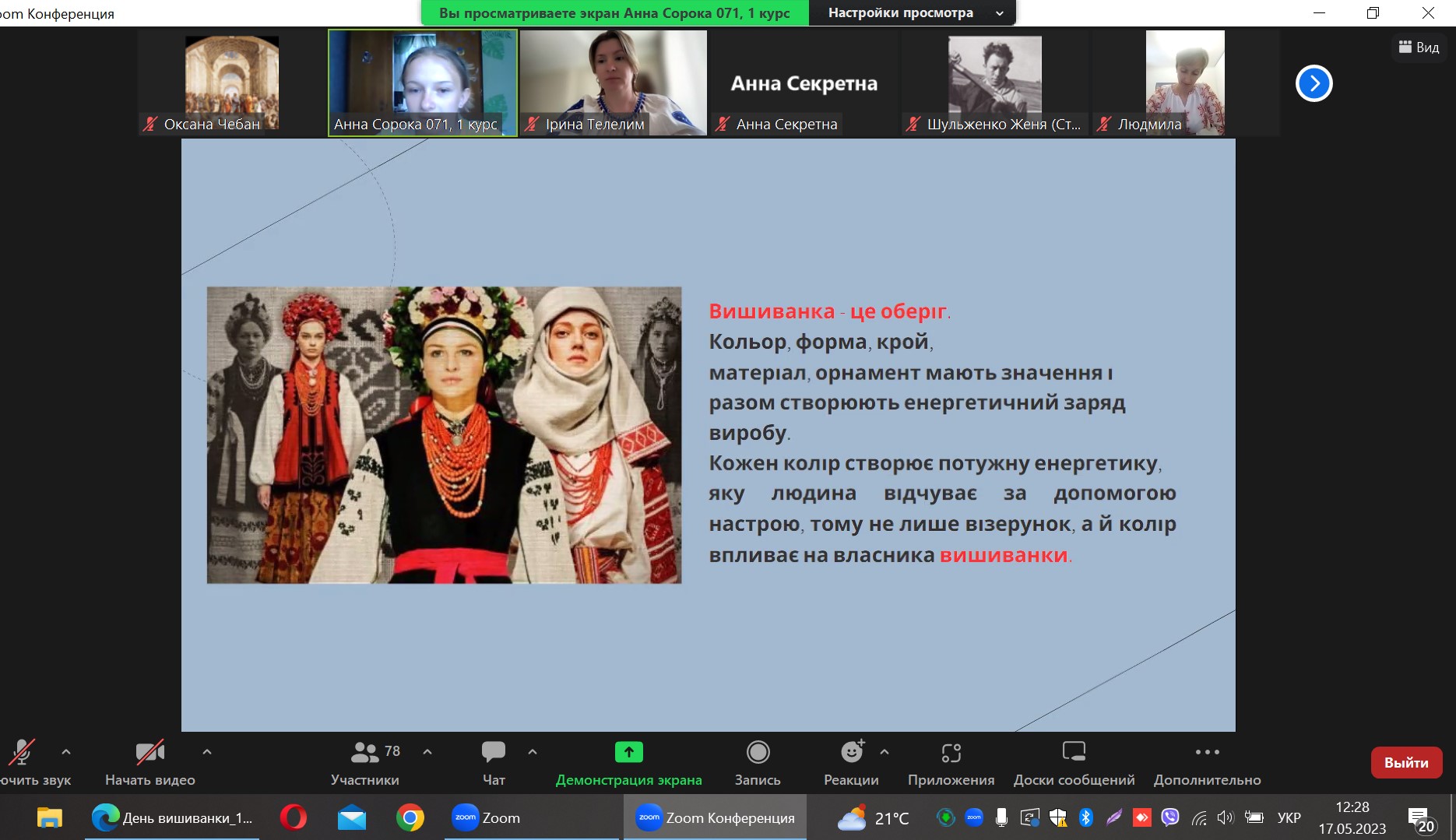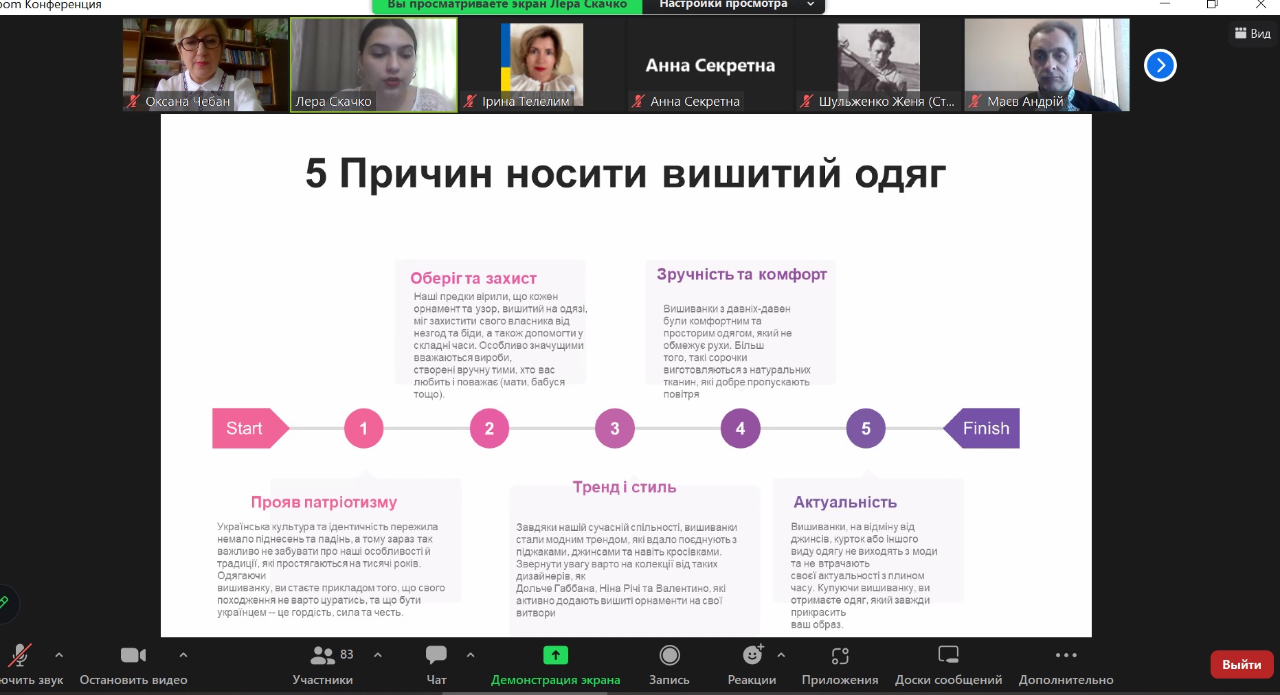 Здобувачі вищої освіти – Степанова Валентина, Скачко Валерія, Фірса Дар’я, Чайникова Марія та Шульженко Євгеній підготували надзвичайно цікаві, насичені та хвилюючі презентації, в яких показали, що вишиванка – це не просто одяг, це оберіг, що об’єднує тих, хто серцем і душею вболіває за свою Батьківщину, поважає багаті традиції українського народу, прославляє безцінні культурні надбання.