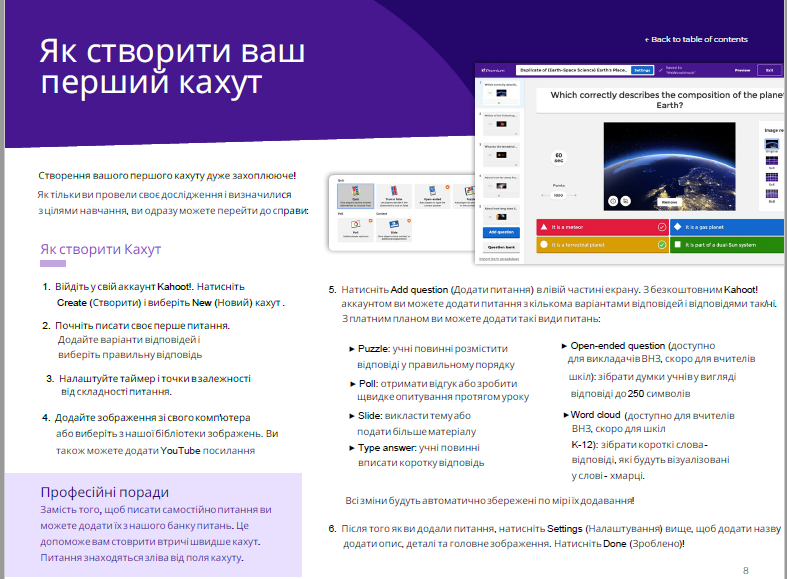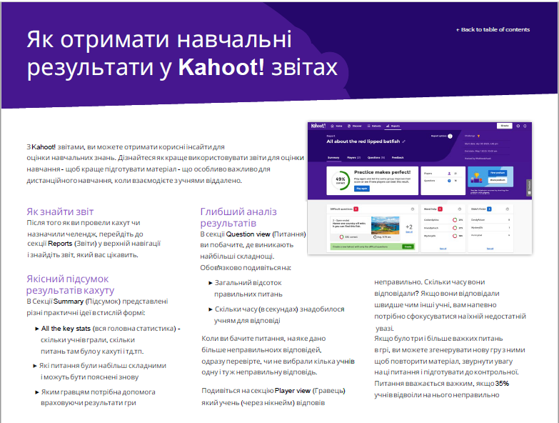 Kahoot! – онлайн сервіс для створення інтерактивних завдань. Дозволяє викладачеві створювати тести, опитування та вікторини. Із Kahoot викладач може створювати квіз (quiz) та тест (True or False). Під час вивчення освітніх компонент, здобувачі мають змогу закріпити матеріал, який вивчається. Квізи здобувачі вищої освіти можуть проходити індивідуально, а можна створити змагання, де за швидкість та правильність відповідей учасники отримують бали.
