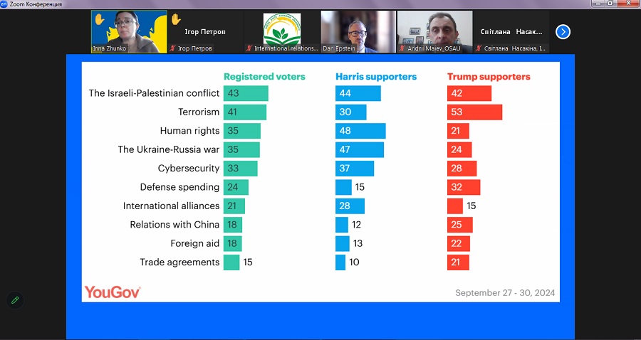 У своїй презентації Даніел Епстайн висвітлив актуальні питання американської зовнішньої політики щодо України, зокрема в контексті внутрішньополітичної конкуренції між основними політичними партіями США. Він проаналізував можливі сценарії розвитку американсько-українських відносин з урахуванням трансформацій у глобальній безпековій архітектурі.
