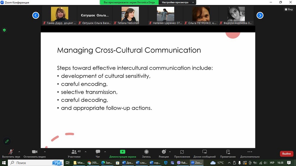 On May 15, 2024, the OSAU teaching staff and students joined with interest the online lecture “Communicating across cultures and the effects on international business management”. The event, which was organized by the Faculty of Economics and Management as part of the celebration of Science Day in Ukraine, was opened by Tetiana Matsiievych, the acting Dean of the Faculty of Economics and Management, Phd of Economic Sciences, Docent. Tetiana Matsiievych made a welcoming speech to the guest speaker and the participants, told about the history of the University of Nebraska (Omaha, USA). Guest speaker: Veronica Doga, Program Director, Nebraska Business Development Center, University of Nebraska.