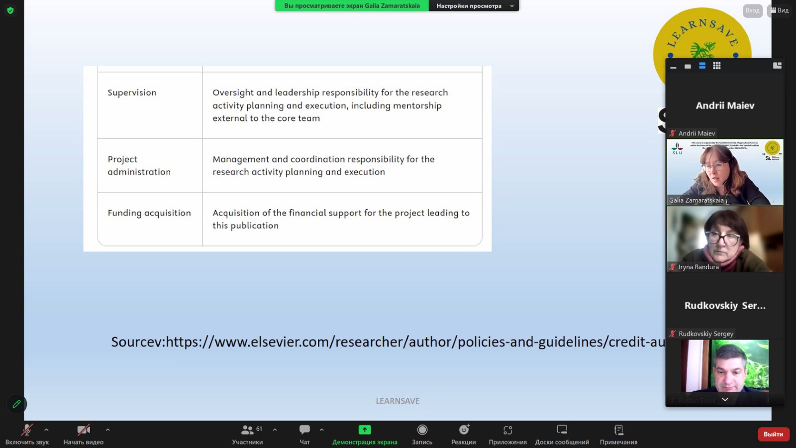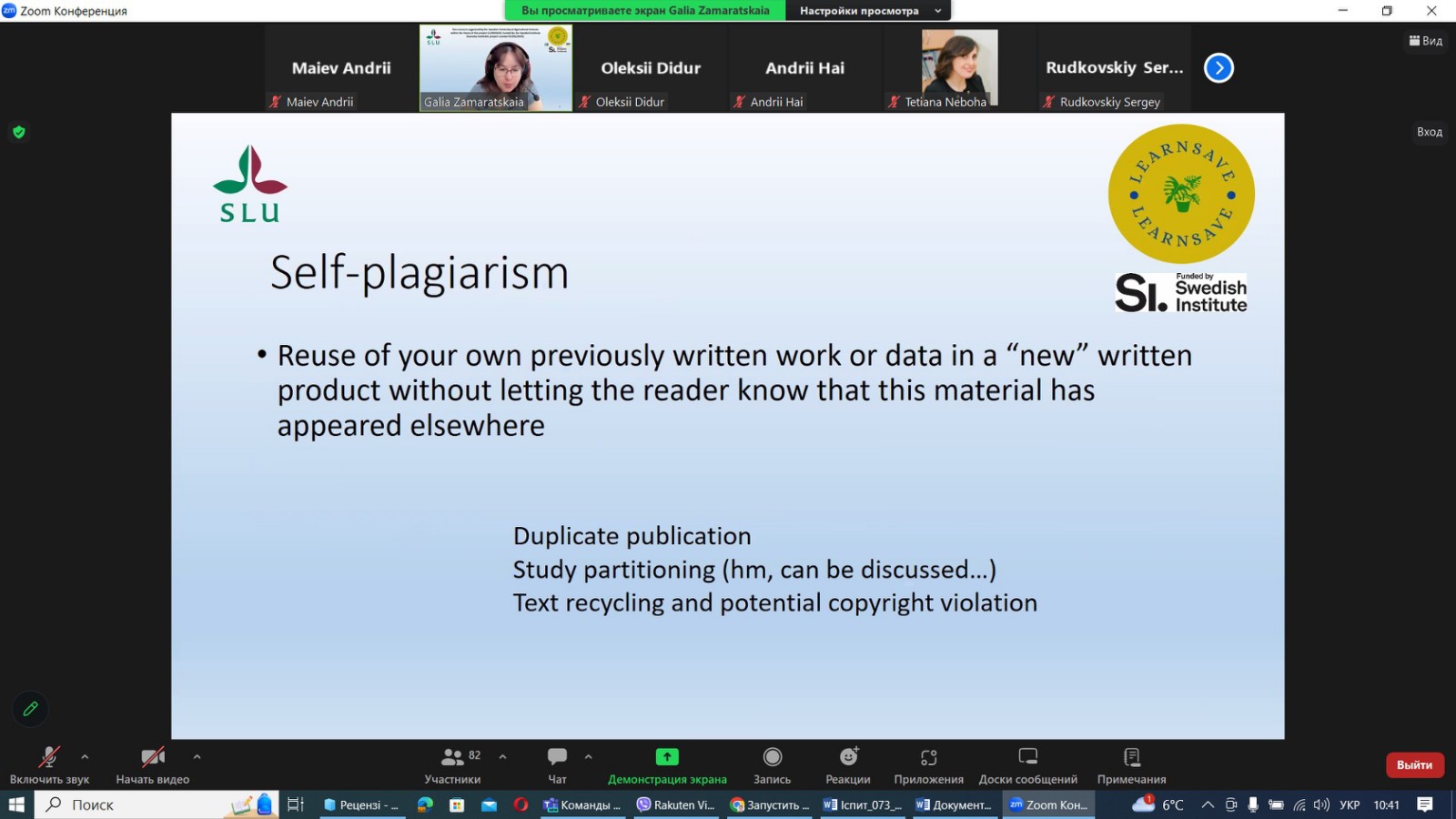 Within the framework of the international project “Learning under attacks – sustainable education at risk in Ukrainian universities” training on the topic “How to write and publish a scientific paper in an international journal” was held on March 21 – 26, 2024. The participants of the event organized by the Swedish University of Agricultural Sciences (Uppsala), were scholars from higher education institutions – partners of the project. Galia Zamaratskaia, Doctor of Philosophy, Associate Professor of the Swedish University of Agricultural Sciences was the main speaker of the event.