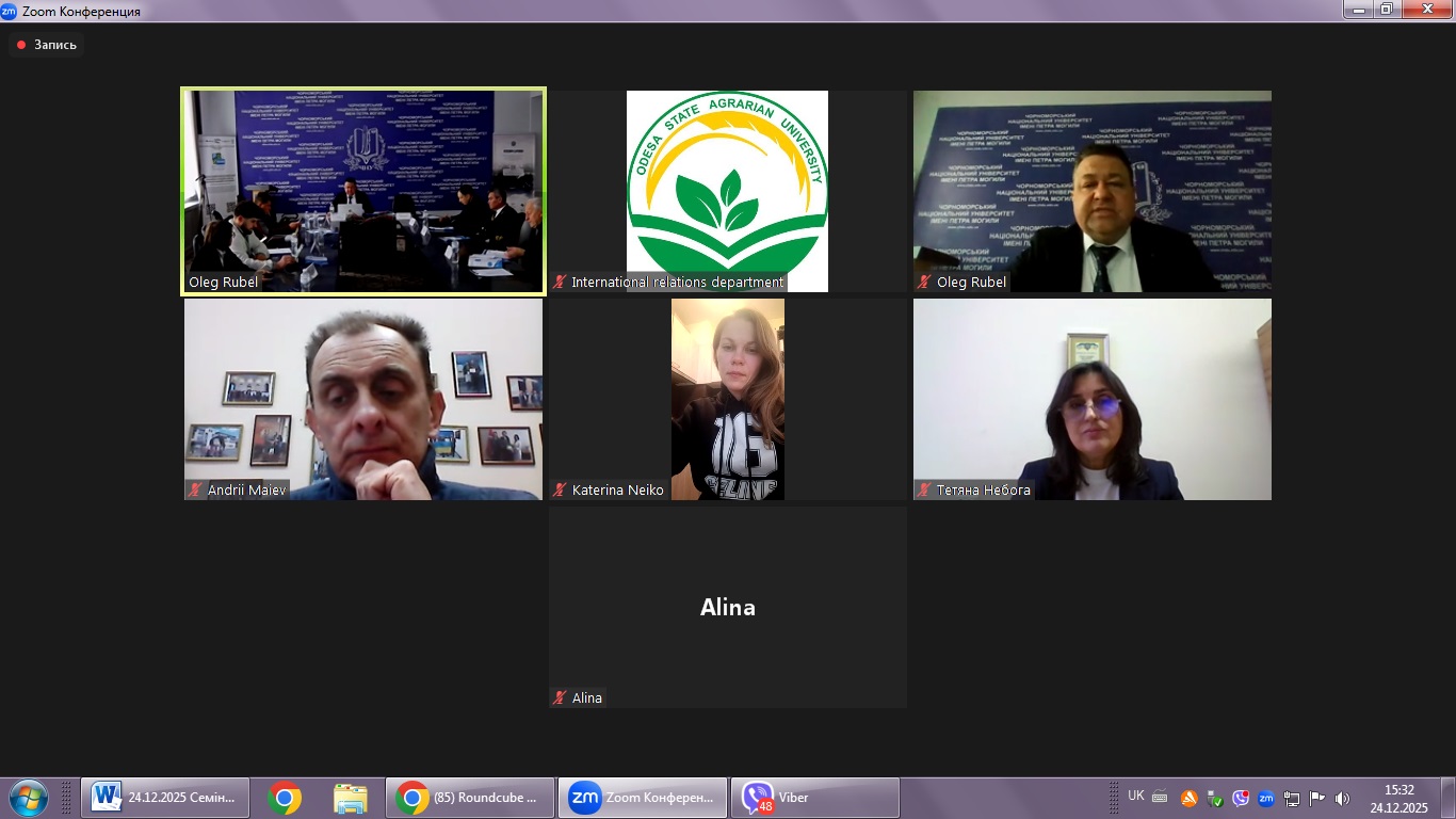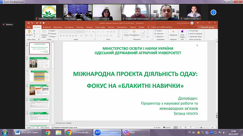 On 23-24 December 2025 representatives of Odesa State Agrarian University Tetiana NEBOHA, Vice-Rector for Scientific Work and International Relations and Andrii MAIEV, Head of the International Relations Department took part in the national seminar “Blue Skills for a Sustainable Future”, held in a mixed format in Odesa and Mykolaiv.