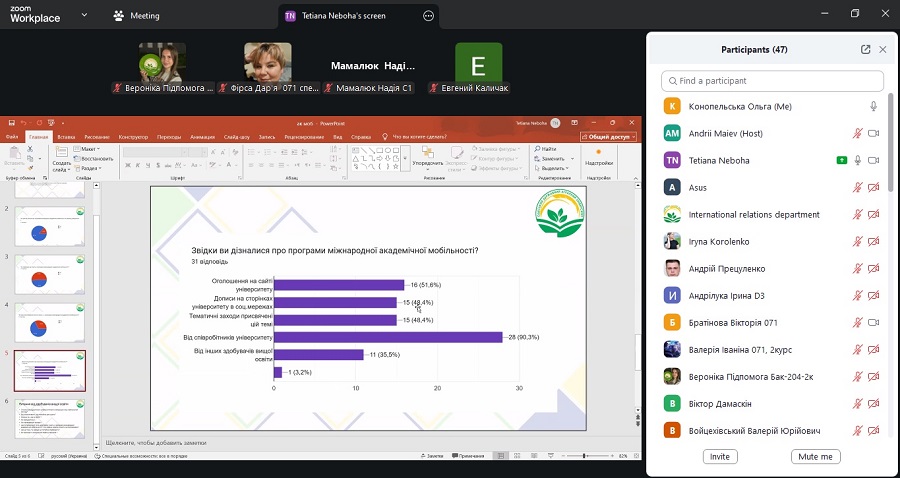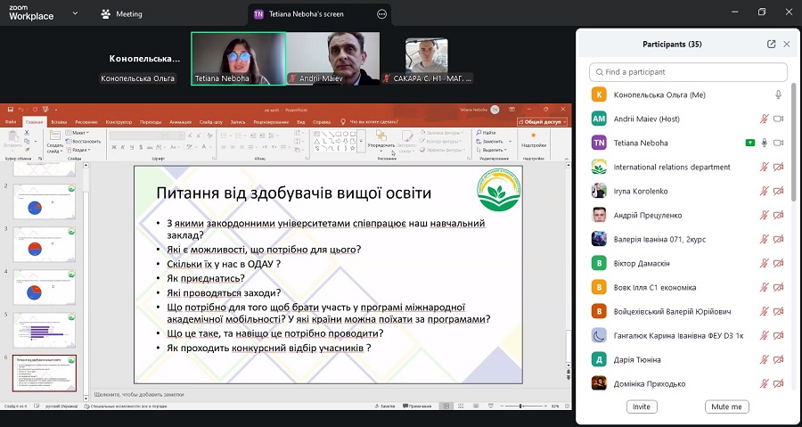 Participants who have not yet taken part in academic mobility programmes had the opportunity to ask questions and learn about the selection criteria, application requirements, and prospects for future studies abroad. Postgraduate students of the specialties “Veterinary Medicine”, “Management”, and “Agronomy” actively participated in the discussion.