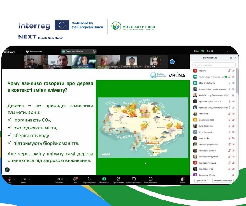 19 березня 2025 року численні викладачі, науковці та здобувачі ОДАУ взяли участь в екологічному заході, що відбувся онлайн в межах міжнародного проєкту “Less vulnerability, more adaptability – pilot remote sensing assisted restoration of green spaces in coastal and urban areas within the Black sea region” (BSB00479), co-funded by the EU Interreg NEXT (Interreg VI-B) Black Sea Basin Programme.