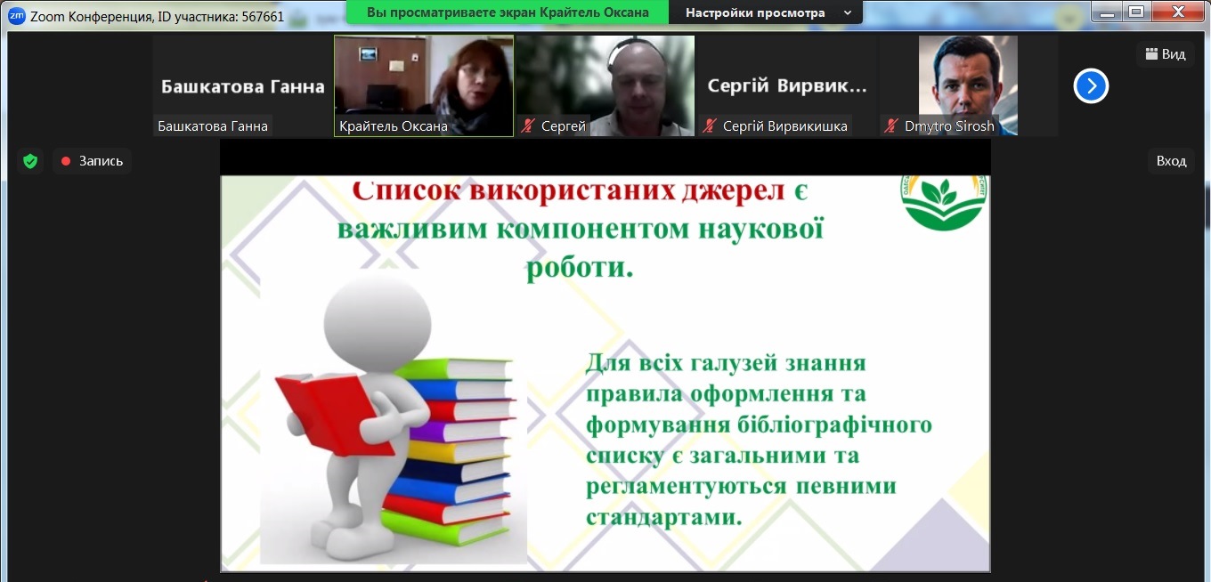 У вебінарі приймали участь завідувач бібліотеки Оксана КРАЙТЕЛЬ, здобувачі вищої освіти ІІІ (освітньо-наукового) рівня, завідувач відділу аспірантури та докторантури, молоді вчені, науково-педагогічні працівники університету.