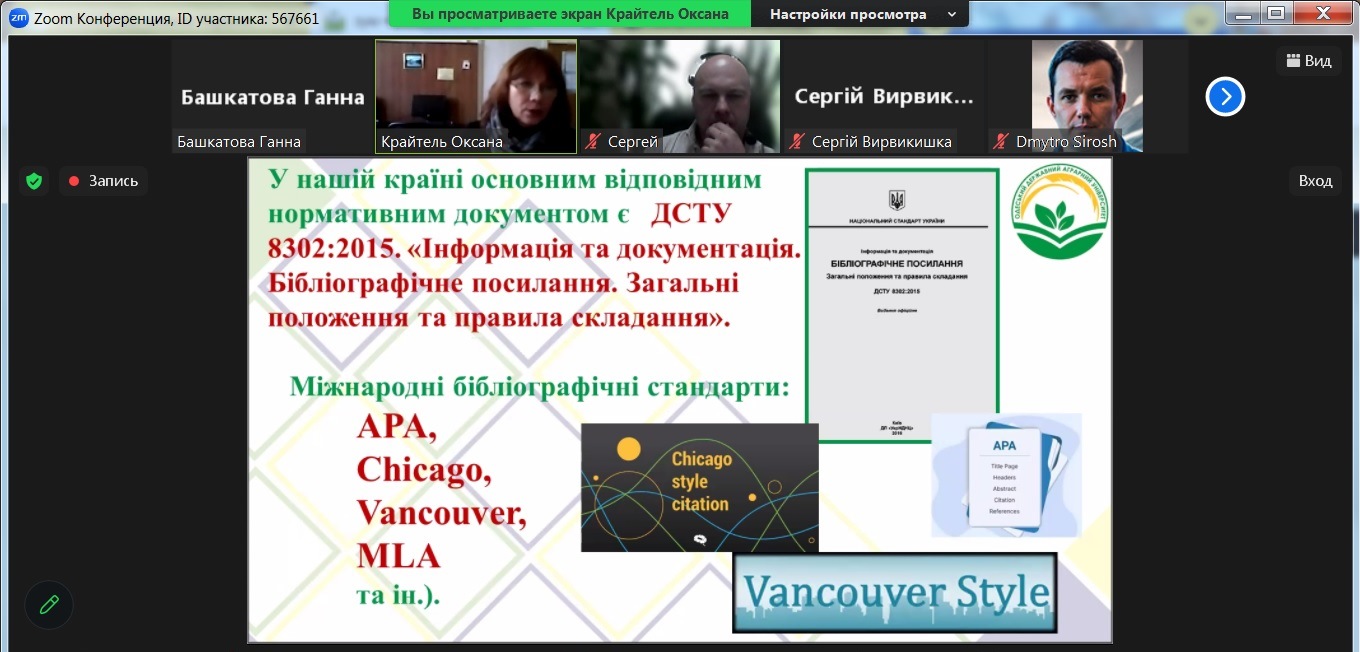 В рамках зустрічі співробітники бібліотеки розповіли про міжнародний стиль оформлення наукових публікацій, звернули увагу на загальні та особливі вимоги при формуванні списку джерел за стилем АРА та за ДСТУ 8302:2015. «Інформація та документація. Бібліографічне посилання. Загальні положення та правила складання».