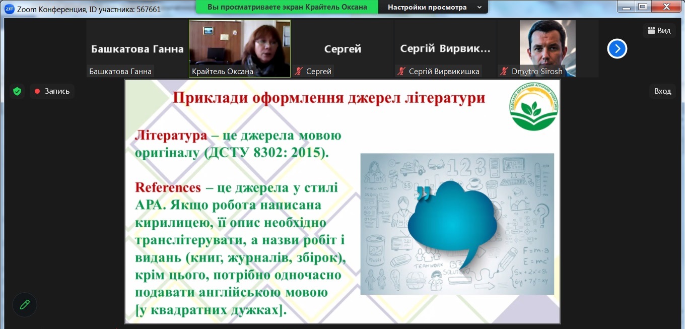 Під час зустрічі обговорювалося багато питань: способи оформлення цитувань за стилем APA, загальні вимоги до списку літератури, структуру бібліографічного посилання, розглядалися приклади відображення авторів в описанні, правила оформлення списку використаної літератури в статтях з періодичного видання та тезах доповідей, електронних ресурсах, законах та стандартах тощо.