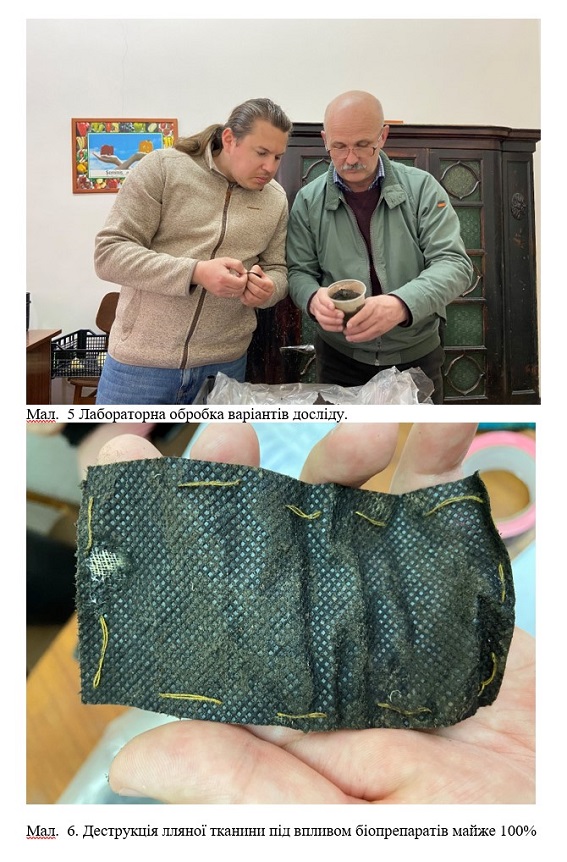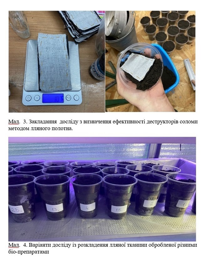 Попередньо у штучних умовах проводилися дослідження впливу перелічених препаратів на біологічну активність ґрунту відібраного із польової дослідної ділянки. На предмет впливу біопрепаратів на деструкцію лляної тканини (імітація пожнивних решток рослин). Норма внесення для всіх препаратів була відповідна рекомендаціям до їх застосування.