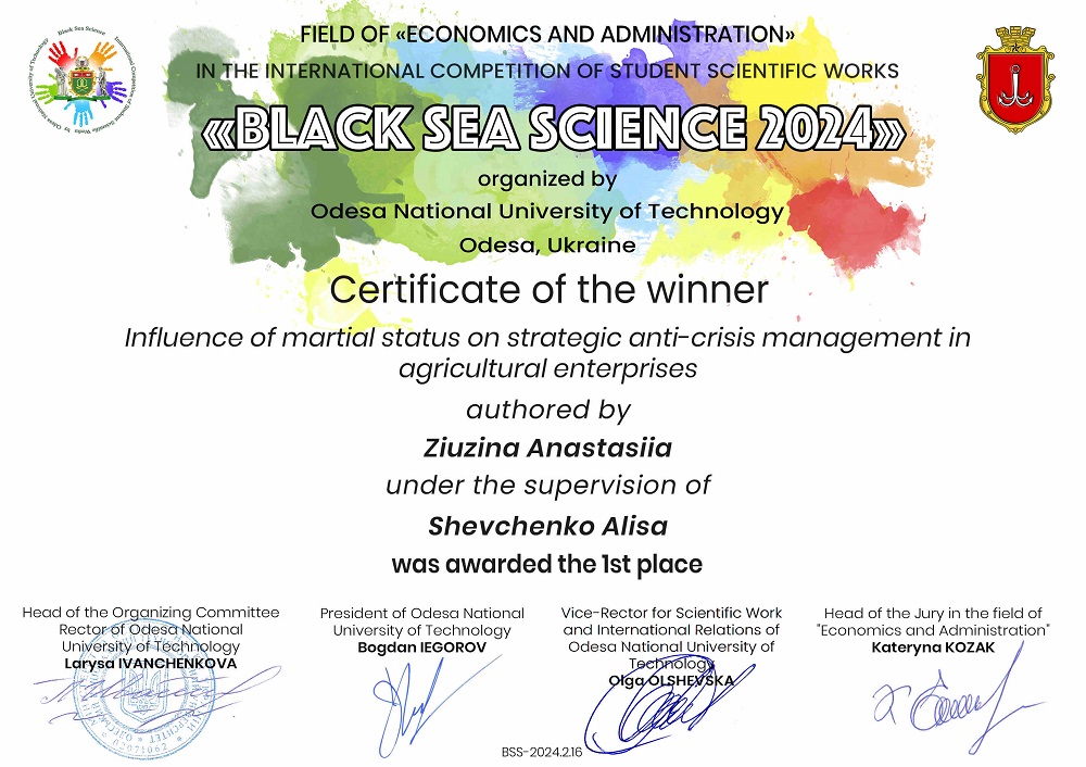 Роботи представниць ОДАУ «Вплив воєнного стану на стратегічне антикризове управління в аграрних підприємствах» (Анастасія Зюзіна, науковий керівник – кандидат економічних наук, доцент Аліса Шевченко), «Оцінка конкурентоспроможності підприємств в умовах невизначеності» (Ольга Конопельська, науковий керівник – кандидат економічних наук, доцент Ольга Петренко) здобули високу оцінку журі, до складу якого увійшли провідні українські та зарубіжні науковці.
