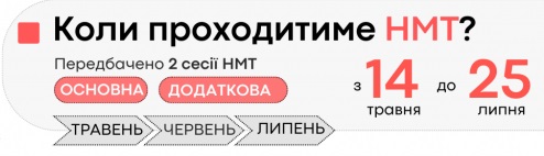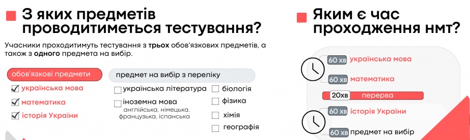 НАЦІОНАЛЬНИЙ МУЛЬТИПРЕДМЕТНИЙ ТЕСТ (НМТ) комп’ютерний онлайновий тест, який міститиме два блоки завдань: основний та додатковий. Обов’язкові навчальні предмети, що увійшли до основного блоку, – українська мова, математика, історія України. Додатковий блок міститиме завдання з навчального предмета, який вступник вибере під час реєстрації для участі в тестуванні.