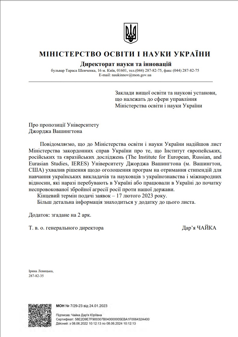 Міністерство Освіти і Науки України повідомляє про пропозицію від Інституту європейських, російських та євразійських досліджень (The Institute for European, Russian, and Eurasian Studies, далі – IERES) Університету Джорджа Вашингтона (м. Вашингтон, США).