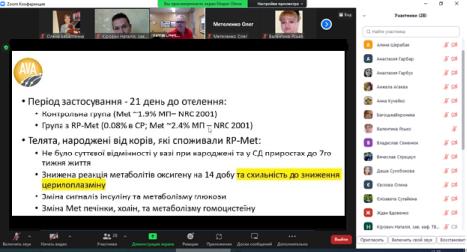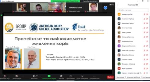 27 жовтня 2022 р. для здобувачів Навчально-наукового інституту біотехнологій та аквакультури Томас Овертон (Cornell University, США) та Петер Йодер (Perdue AgriBusiness Animal Nutrition, США) прочитали лекцію «Протеїнове та амінокислотне живлення корів». Американські спеціалісти розповіли про особливості протеїнового й амінокислотного живлення, поділилися своїм досвідом оптимізації годівлі дійних корів та корів у транзитний період і з задоволенням відповіли на усі питання, які виникли у ході лекції.