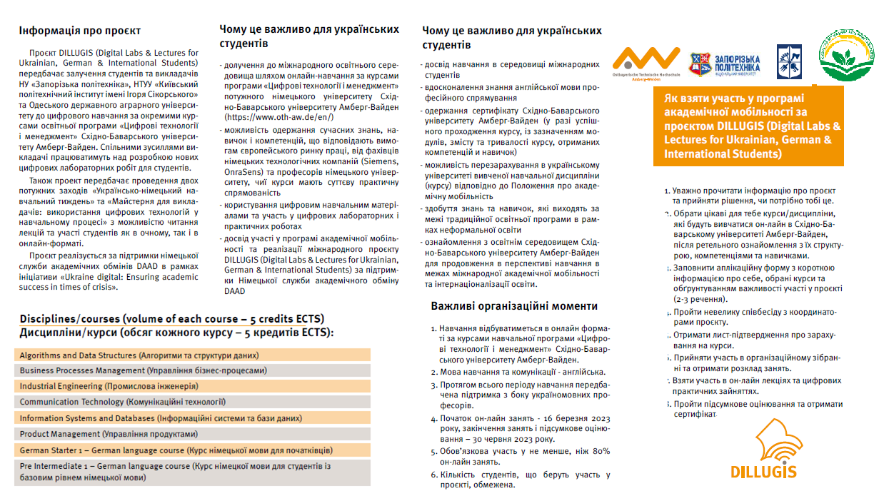 Проєкт DILLUGIS (Digital Labs & Lectures for Ukrainian, German & International Students) передбачає залучення студентів та викладачів НУ «Запорізька політехніка», НТУУ «Київський політехнічний інститут імені Ігоря Сікорського»