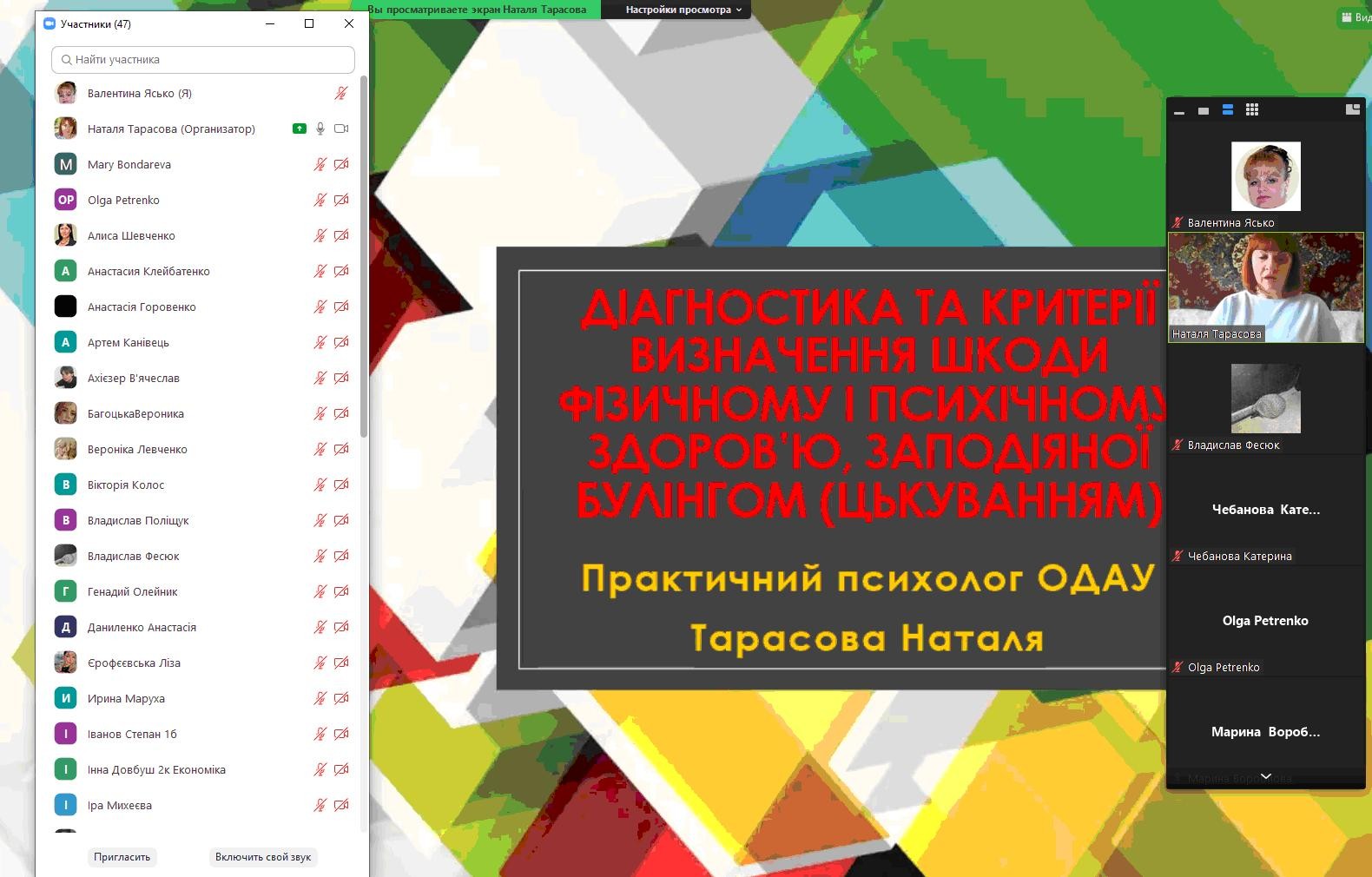 28 лютого 2023 року відбулася зустріч здобувачів вищої освіти та науково-педагогічних працівників зі штатним психологом Одеського державного аграрного університету Наталією Тарасовою. Тема зустрічі: «Діагностика та критерії визначення шкоди фізичному та психічному здоров’я заподіяної булінгом (цькуванням)».