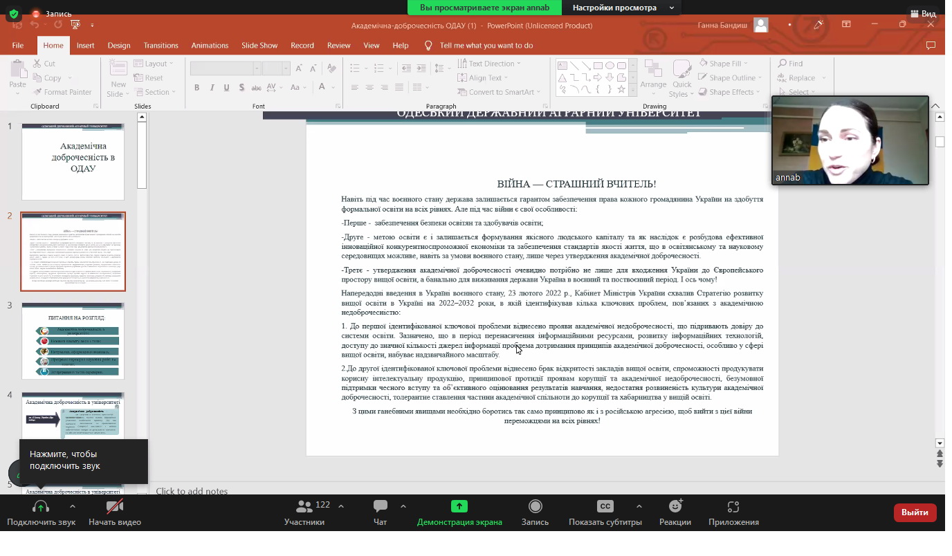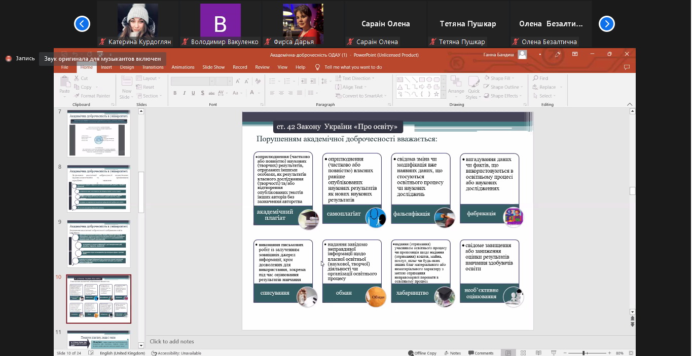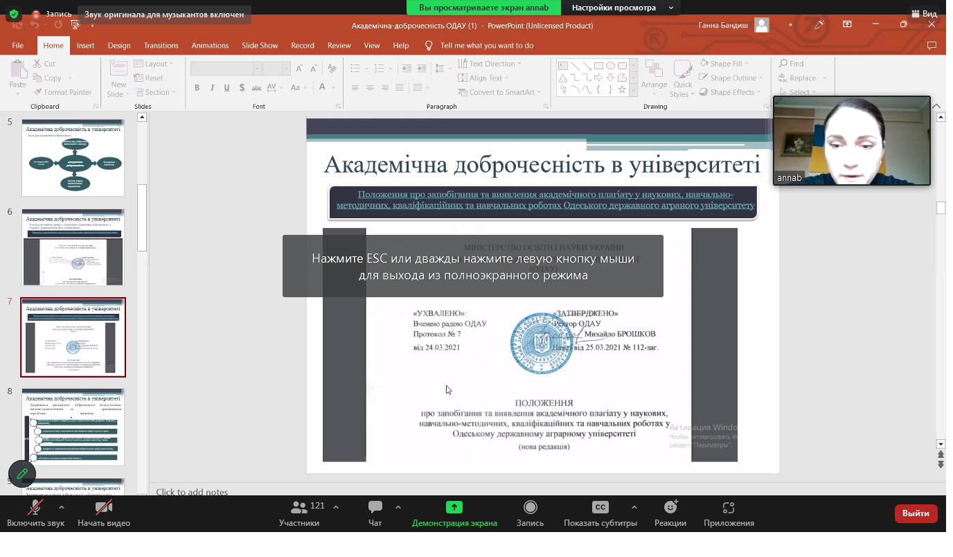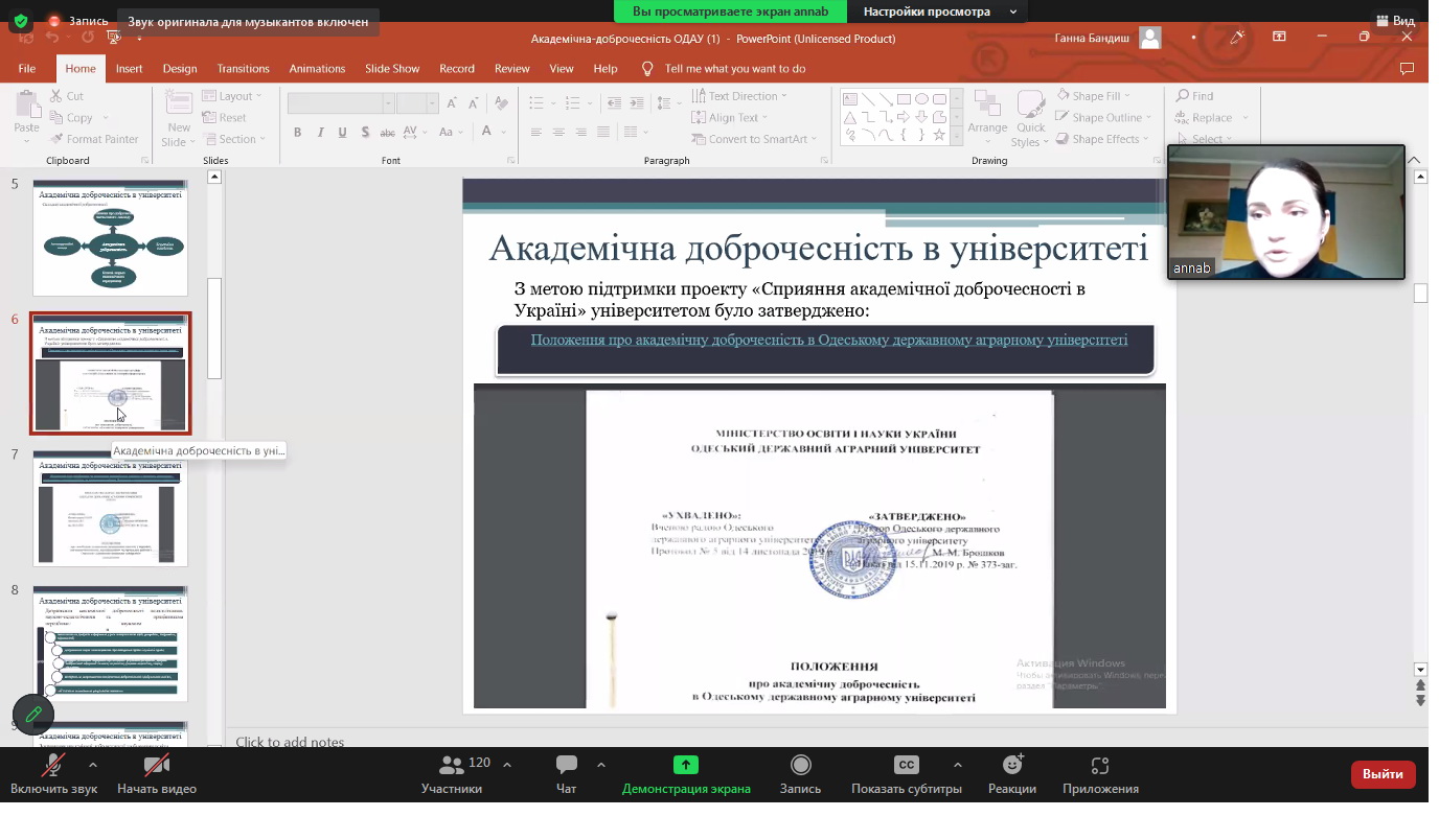 Під час семінару обговорили загальні риси академічної доброчесності та етики дослідницької роботи, розглянули найтиповіші приклади порушень академічної доброчесності учасниками освітнього процесу, поради щодо цитування і використання об’єктів права інтелектуальної власності під час підготовки до навчальних занять, основи академічного письма, нормативно-правове забезпечення академічної етики, доброчесності в Одеському державному аграрному університеті, а саме Положення про академічну доброчесність в ОДАУ та Положення про запобігання та виявлення академічного плагіату у наукових, навчально-методичних, кваліфікаційних та навчальних роботах у Одеському державному аграрному університеті (нова редакція).