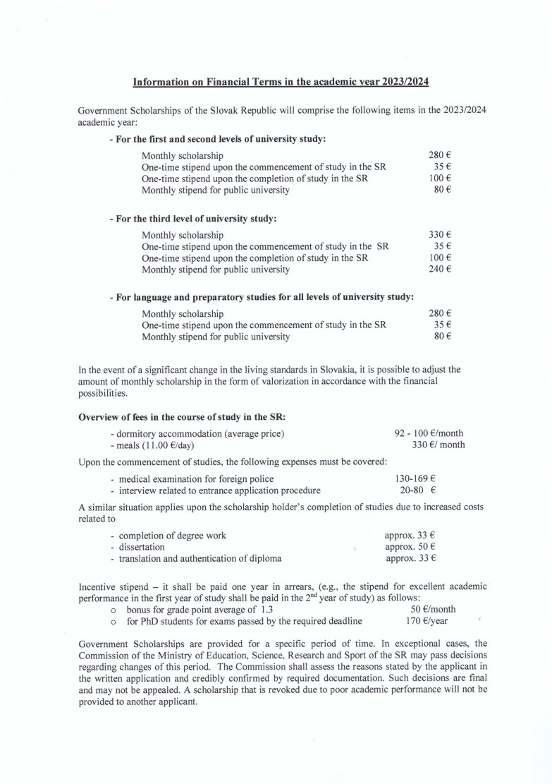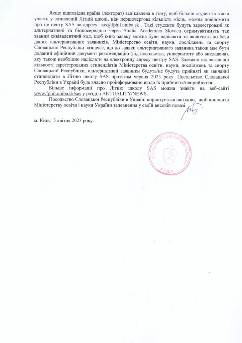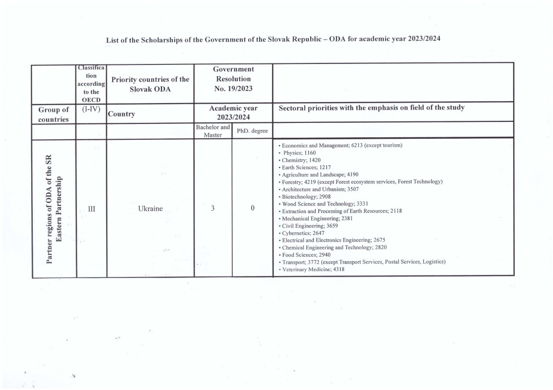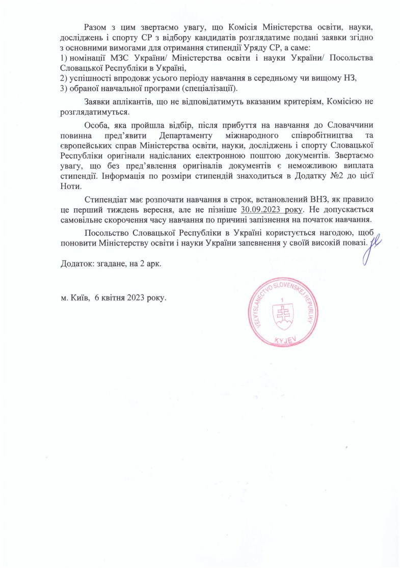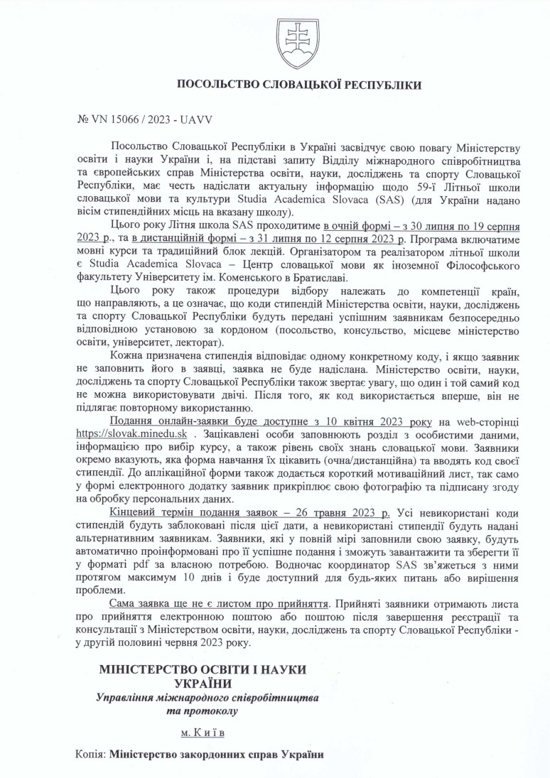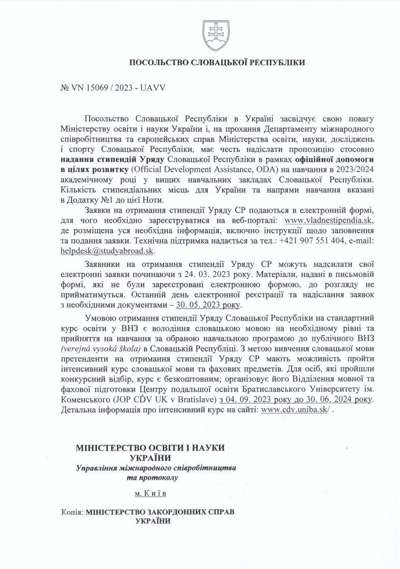 За інформацією Посольства Словацької Республіки в Україні, Урядом Словацької Республіки в рамках офіційної допомоги в цілях розвитку, оголошено про стипендійні можливості для громадян України на навчання у закладах вищої освіти Словацької Республіки на 2023/2024 навчальний рік. Лист Міністерства Освіти і Науки України додається.