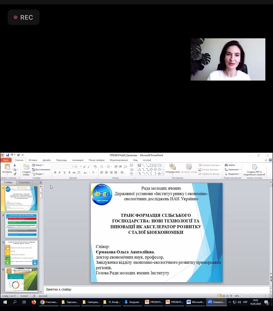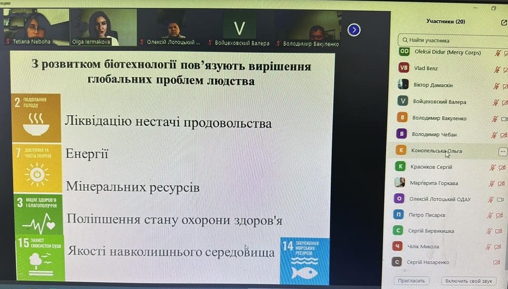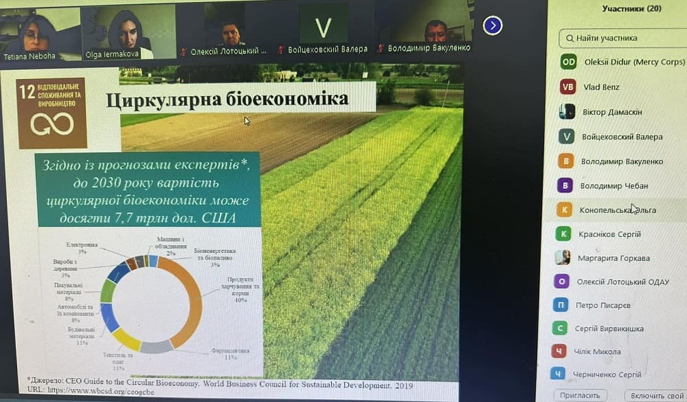 На зустрічі розглядалися напрямки економічного зростання суспільства, що не шкодять довкіллю та є соціально узгодженими. Спікер Ольга ЄРМАКОВА – доктор економічних наук, професор, завідувачка відділу економіко-екологічного розвитку приморських регіонів, голова Ради молодих вчених Державної установи «Інститут ринку і економіко-екологічних досліджень НАН України» розкрила учасникам сучасні тенденції розвитку сільського господарства, охарактеризувала глобальні проблеми, вирішення яких пов’язують з розвитком біотехнології – ліквідація нестачі продовольства, енергії, мінеральних ресурсів, поліпшення стану охорони здоров’я та якості навколишнього середовища. Основними складовими сталої біоекономіки є соціальна, екологічна та економічна стійкість – сталість і циркулярність, що сприяє оновленню галузей промисловості, модернізації первинних виробничих систем, захисту навколишнього середовища.