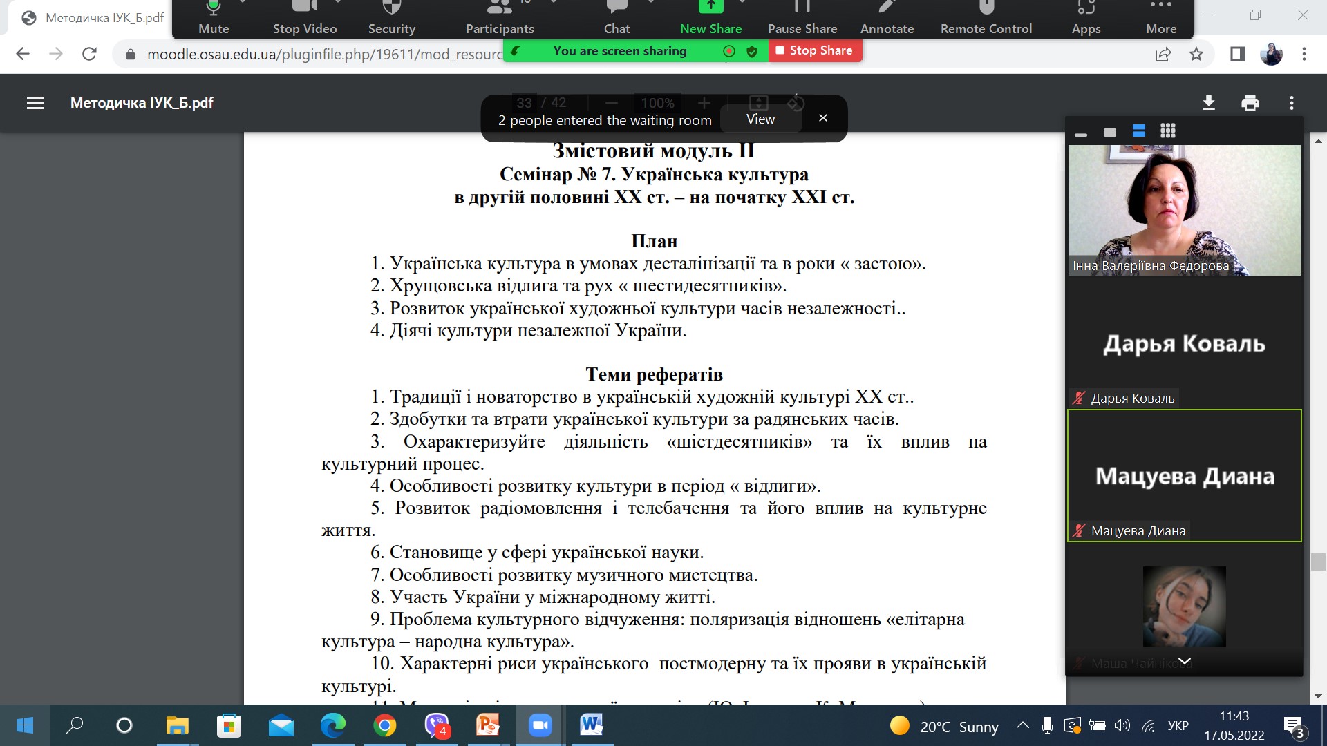 Викладачем кафедри філософії, історії і політології Федоровою. І.В. 17.05.2022 року було проведено відкритий семінар на тему «Українська культура в другій половині ХХ ст. – на початку ХХІ ст.». Здобувачі вищої освіти 1 курсу спеціальності 204 ТВППТ (3.10) навчально-наукового інституту біотехнологій та аквакультури розглянули теоретичні питання: