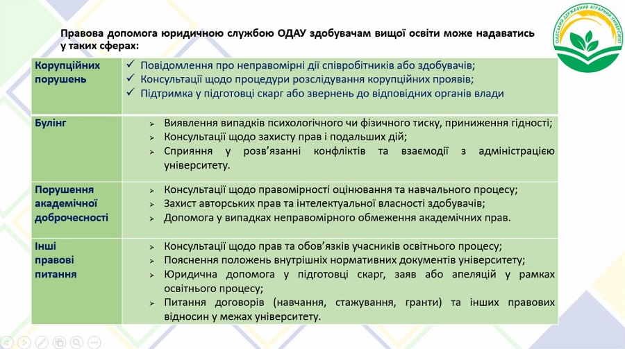 15 жовтня 2025 року в Одеському державному аграрному університеті було проведено онлайн-лекцію, присвячену академічній доброчесності. Лекцію провела уповноважена з антикорупційної діяльності ОДАУ Клара Марченко. У заході взяли участь здобувачі вищої освіти всіх курсів, а також науково-педагогічні працівники університету.