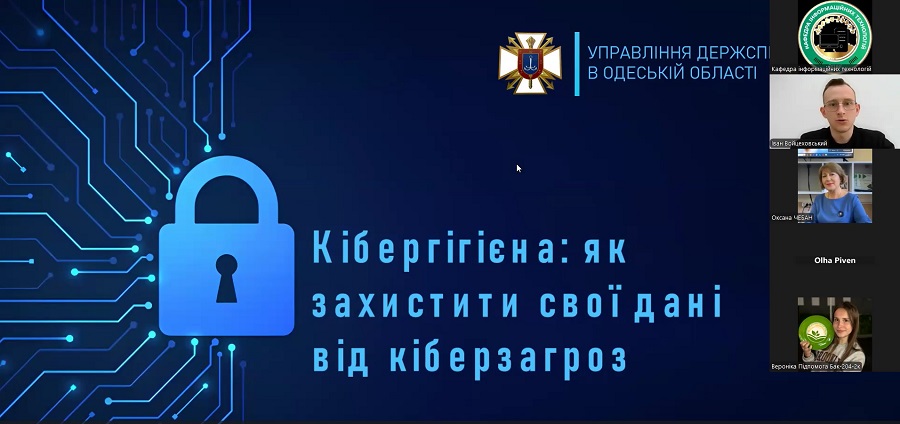 7 квітня 2026 року в онлайн-форматі на платформі Zoom в ОДАУ відбувся тренінг на тему «Кібергігієна: як захистити свої дані від кіберзагроз». Захід організовано за підтримки Управління Держспецзв’язку в Одеській області в межах реалізації державної політики у сфері кіберзахисту.
