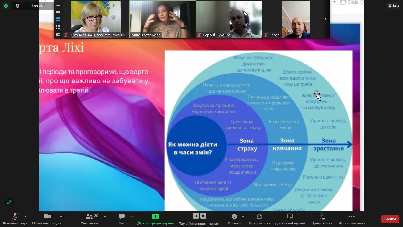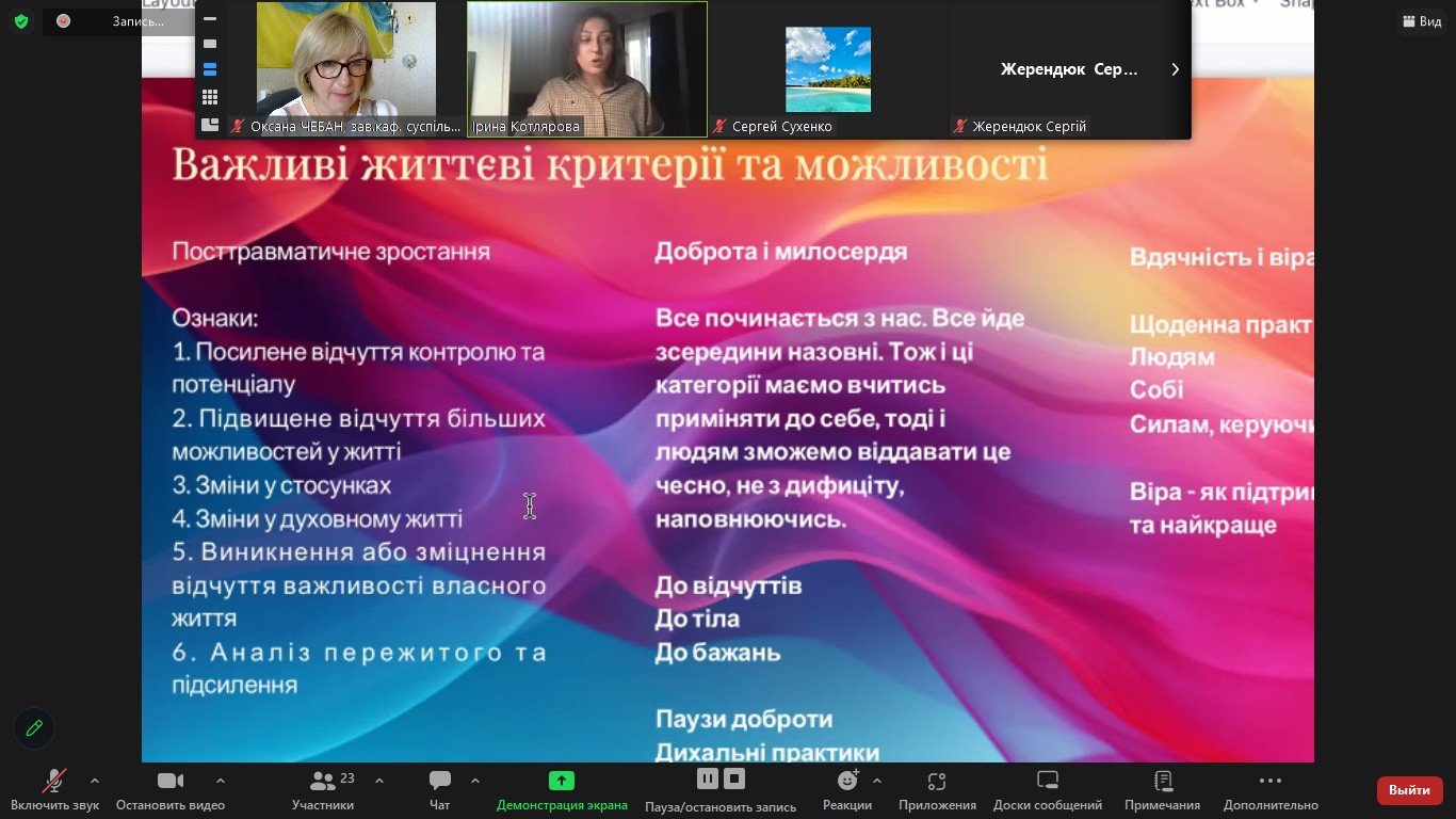 За ініціативи кафедри суспільно-гуманітарних наук за участю Ради молодих вчених 30 жовтня 2023 року відбулась зустріч здобувачів вищої освіти третього (освітньо-наукового) рівня з практичним психологом та спеціалістом із сучасної  психосоматики ІРИНОЮ КОТЛЯРОВОЮ.