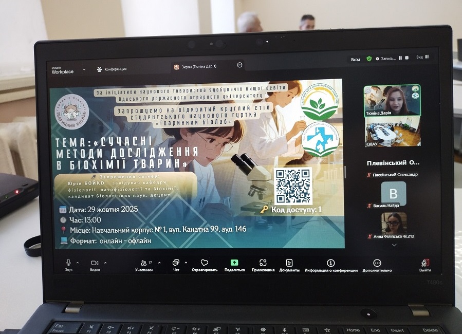 За участі Наукового товариства здобувачів вищої освіти Одеського державного аграрного університету 29 жовтня 2025 року в R&D центрі ОДАУ відбулося відкрите засідання студентського наукового гуртка «Тваринний БіоЛаб» на тему «Сучасні методи дослідження в біохімії тварин».