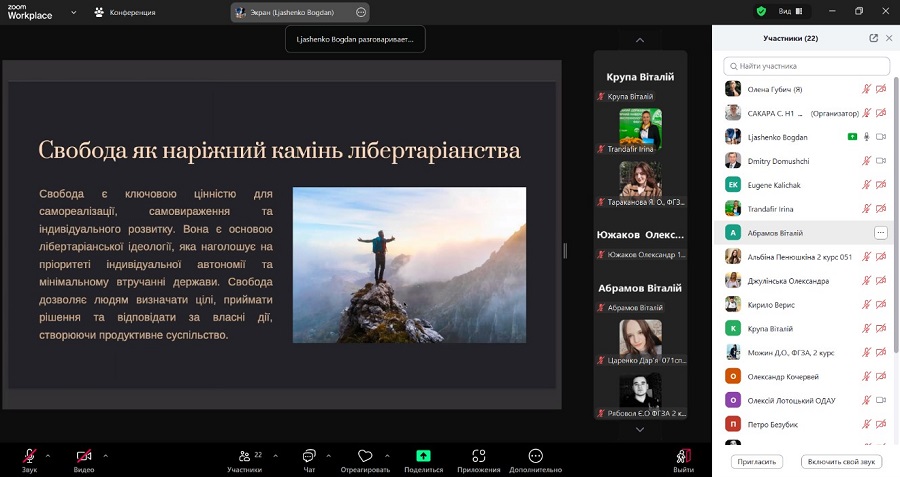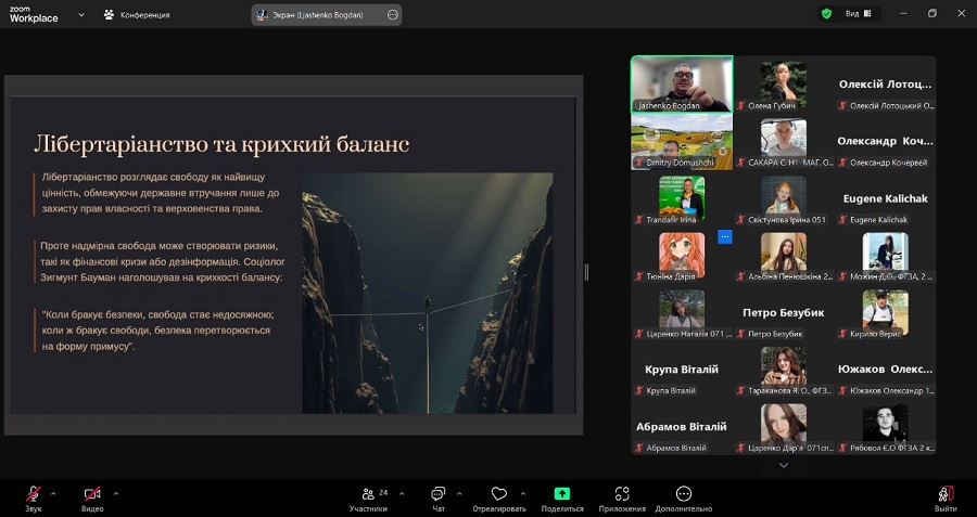 Темою лекції стали соціально-психологічні чинники трансформації політичної культури лібертаріанства та дилема вибору між свободою і безпекою. Лектор розкрив ключові аспекти взаємозв’язку особистісних цінностей, політичних установок та суспільних процесів, що формують сучасний політичний світогляд.