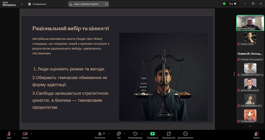 Учасники лекції активно обговорювали представлені концепції, ставили запитання та ділилися власними думками щодо актуальних соціально-політичних викликів. Формат онлайн також дав змогу приєднатися до обговорення науковцям та студентам із інших міст України через Zoom, що підкреслило відкритість і доступність заходу.