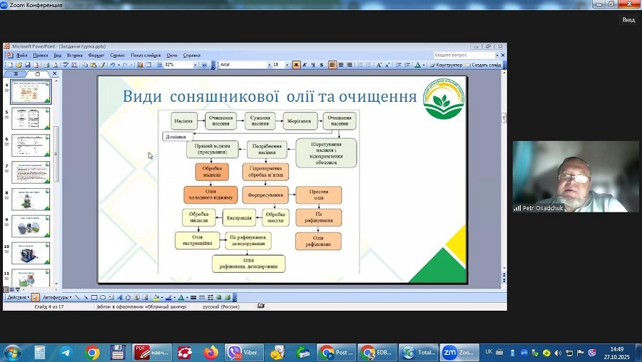 Під час лекції на тему «Очищення олії від домішок сучасними методами» професор представив сучасні технологічні рішення, що дозволяють підвищити якість і ефективність процесів очищення рослинних олій. Учасники засідання дізналися про інноваційні методи фільтрації, центрифугування та використання мембранних технологій у виробництві, а також обговорили перспективи їх застосування у сучасних умовах.